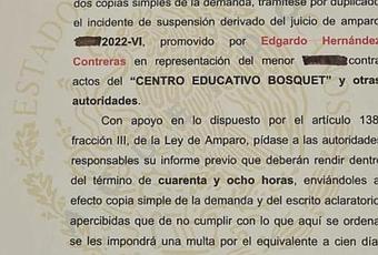 Con el paso de los días no sólo no cesaron los malos tratos sino que además con conocimiento pleno de la directora general incluso se llegó al grado de suspender al menor. Es por ello que él se Edgardo Hernández decidió recurrir al juicio de amparo para proteger los derechos de sus hijo pues además de que ya se pagó el año completo es preocupa que al niño ya le causa pánico pensar en la escuela.