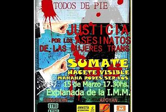 Ante el hecho de que los seis asesinatos de mujeres trans -ocurridos durante 2011 y 2012- siguen sin ser resueltos, la Unión Trans del Uruguay (UTRU), con el apoyo de MYSU, Secretaría de la Mujer de la Intendencia de Montevideo y Amnistía Internacional, realizará una concentración en protesta por las continuas evasivas al tema.