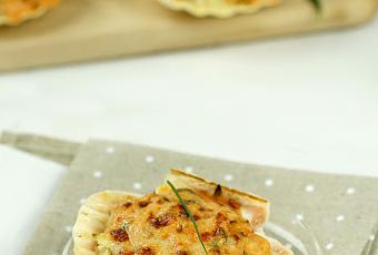 En una sartén, con un poco de aceite, saltearemos el bacalao bien escurrido, secado y desmigado durante un par de minutos. Reservaremos. Pelaremos y trocearemos los langostinos y los saltearemos en la misma sartén que hemos utilizado pare el bacalao. Reservaremos. Ahora nos pondremos con la bechamel, para ello pondremos una sartén al fuego con el aceite, agregaremos las cabezas de los langostinos y las salteremos durante un par de minutos aplastándolas ligeramente para que salga su jugo. Añadiremos la harina y removeremos bien para que esta se tueste. Iremos añadiendo la leche a temperatura ambiente, poco a poco, y con unas varillas iremos removiendo continuamente. Cuando adquiera la textura deseada le añadiremos la nuez moscada y el perejil picado. Uniremos el bacalao con los langostinos y rellenaremos las conchas. Cubriremos con la bechamel y espolvorearemos el queso rallado. Gratinaremos hasta que coja elcolor deseado.
