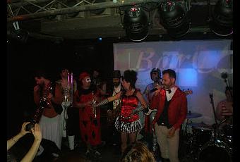 Mientras que Mariano González se iba al Teatro Sanpol a ver a ELE nosotros nos íbamos a la sala BarCo a ver el “Bronson Circus”, el mayor espectáculo del mundo, o al menos uno de los shows musicales más divertidos y marchosos que se pueden vivir en la geografía española a día de hoy. El grupo de 10 componentes de The Bronson cambiaban para su indumentaria en escena el look militar por el de personajes circenses para presentarse de nuevo en Madrid. A eso de las 23.30h se metían como podían en el pequeñito escenario de la BarCo, inapropiado para una formación tan nutrida, y arrancaron con una de nuestras canciones favoritas de su repertorio “You are the devil”. Aquí les insertamos un fragmento que grabamos de la misma.Al contrario que Javiera Mena la noche anterior, The Bronson se podrán quejar de otras cosas de la sala BarCo, pero de una de las cosas que no pueden poner objeciones es del sonido que disfrutaron. Cada uno de los instrumentos de la numerosa banda que son The Bronson sonó muy bien durante toda la noche. En esos primeros minutos sonó el “Get down on it” de Kool And The Gang, pero esta vez la versión se vio interrumpida de sopetón, cerrándose así el primer bloque musical de arranque. Quedaba mucha velada por delante.