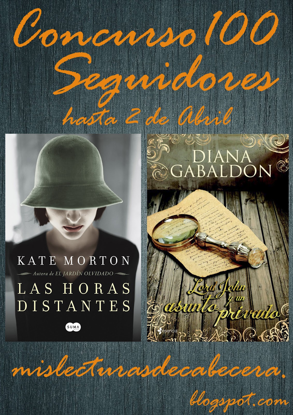 Bueno a continuación os pongo las BASES para participar en el concurso:·Ser seguidor del blog, y dejar una entrada en este post diciendo que queréis participar en el concurso 100 seguidores, dejando vuestra url de perfil. + 1 PUNTO·Tener una dirección postal en España a donde enviar los libros (lo siento por aquellos seguidores extranjeros, pero voy a ser yo la que corra con todos los gastos del sorteo y los costes de enviarlos fuera son muy altos).Ambos requisitos son obligatorios.A su vez, podréis ganar PUNTOS EXTRA: +5 PUNTOS.- Por hacer una entrada en vuestros blogs (que puede ser compartida).+5 PUNTOS.- Por llevaros el banner a vuestro blog enlazándolo a esta entrada.+2 PUNTOS.- Por anunciarlo en facebook+2 PUNTOS.- Por anunciarlo en twitter+1 PUNTO.- Por seguirme en facebook+1 PUNTO.- Por seguirme en twitterUn total de 17 PUNTOS.El plazo para apuntarse al sorteo comienza hoy y terminará el 2 de abril. El 5 de abril colgaré la lista de participantes y dos días después se anunciará a los ganadores que serán elegidos por Random. El primer número que salga se llevará Las horas distantes, y el segundo, Lord John y un asunto privado.Espero que os gusten los libros que he elegido para el concurso, y que os animéis a participar.Muchos besos!!