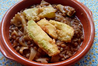 Yo me decanté por la cocina árabe y preparé las Lentejas al estilo sirio de la chef Anud Abbassi, que publiqué en este blog hace unos meses. Para los que no hayáis leído la receta aún, estas lentejas difieren mucho de los tradicionales estofados de lentejas que tenemos en España: son unas lentejas cocinadas sobre una base de tamarindo, melaza de granada y tomate y condimentadas con comino, ajo y cilantro. El resultado es un plato salado pero con un fondo suave entre dulce y picantón... vamos, para chuparse los dedos. Por último, freí unos calabacines y los coloqué en el plato para acompañar y darle un toque crujiente.
