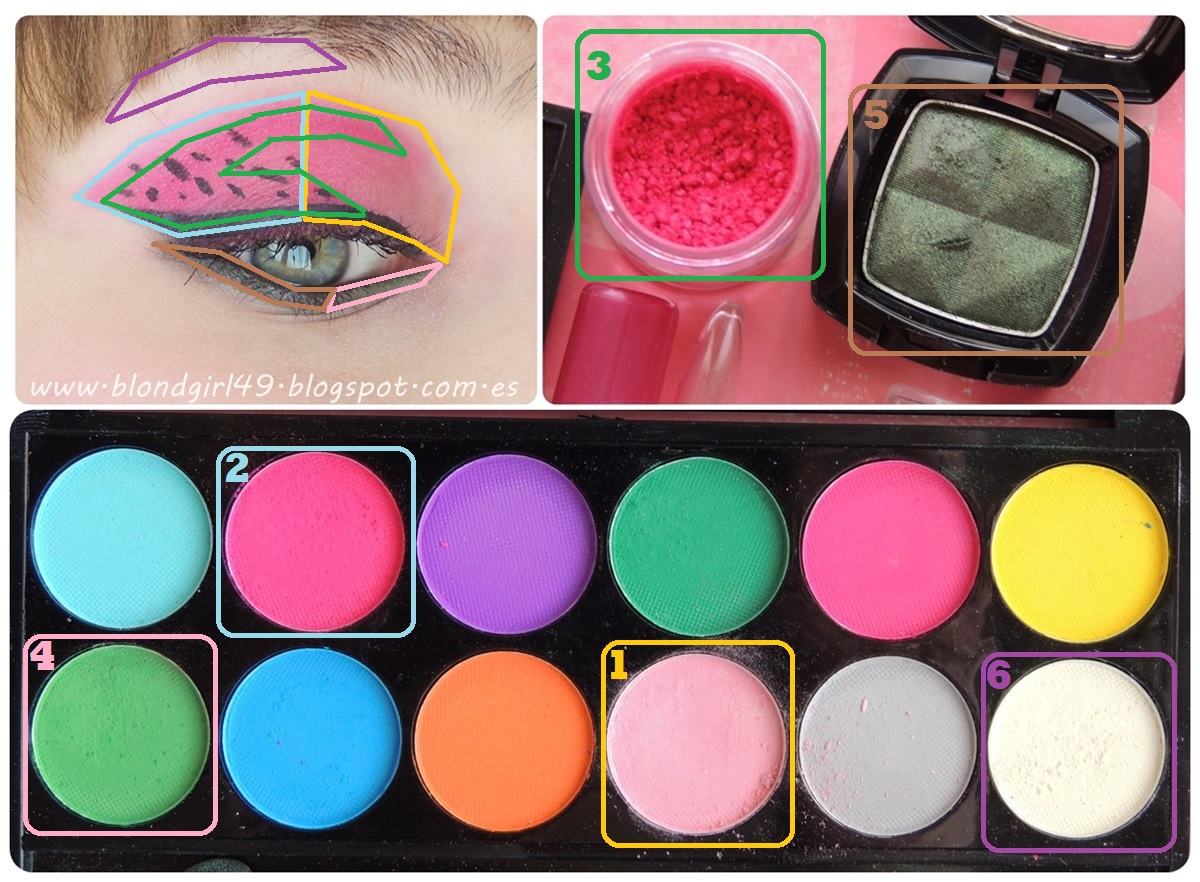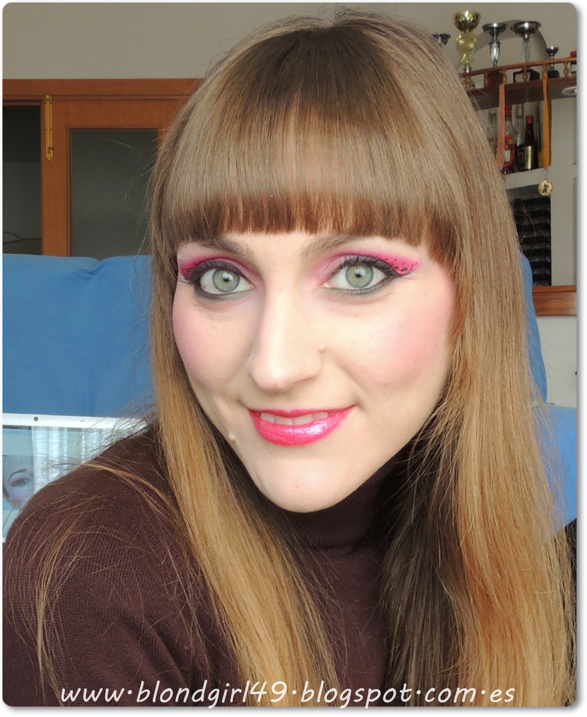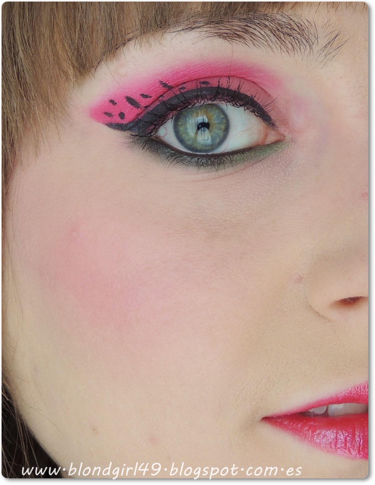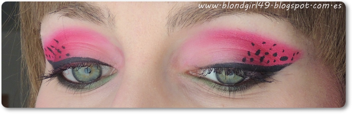 PRODUCTOS EMPLEADOS:Rostro:- Stick corrector de Deliplus (saldrá en las compras de Abril)- Base de maquillaje Infinite Matt up to 18h de Catrice (pronto os haré review)- Polvos translúcidos Class of 2013 (se me rompió lo poco que me quedaba y lo puse en otro envase jeje)- Colorete Nº02 DeliplusOjos:- Jumbo milk de NYX- Sombras: cricket, pout, floss y Powi de la paleta Ultra Mattes V1 brights de Sleek (review en esta entrada)- Sombra Exotic Green de NYX- Pigmento nº15 de KikoLápiz de ojos negro de YR- Eyeliner líquido de Rimmel London- Máscara de pestañas volum' express de MaybellineLabios:- Jumbo para labios, frambuesa nº03 Glamour N&C de DeliplusOJITOS:PROCEDIMIENTO:Primero he preparado el párpado con el jumbo Milk de NYX para que las sombras se adherieran bien. En la primera mitad del párpado móvil correspondiente a la zona del lagrimal he aplicado la sombra Floss (rosa muy clarito mate) y en la otra mitad la sombra Pout (un fucsia muy llamativo mate) las dos de la paleta de Sleek. Luego para intensificar el color fucsia he usado el pigmento nº15 de Kiko que tiene un ligero brillito y es un pelín más intenso que la sombra Pout de Sleek, lo he aplicado por la V externa y la zona de la cuenca del ojo, difuminándola con las otras sombras. En la parte inferior, el primer tercio empezando por la parte del lagrimal he usado la sombra cricket y en los otros dos tercios la sombra Exotic Green de NYX. En el arco de la ceja he aplicado la sombra Powi (blanca mate). Con el eyeliner líquido he delineado el párpado superior a ras de pestañas y también he hecho manchitas en forma de pepitas (o al menos lo he intentado xD). En la raya de agua he usado el lápiz de ojos negro de Yves Rocher. Para acabar he aplicado la máscara en las pestañas superiores.OJOS Y MEJILLA:En la mejilla quise usar un tono rosadito para que quedara bien los fucsias que había empleado en los ojos y labios :)ROSTRO COMPLETO:Cuando me estaba sacando las fotos le pregunte a mi madre: ¿a que te recuerda el look que llevo? (ella no sabía ni que se trataba de frutas la cosa) y me soltó pues no sé...¿una mariquita? de ahí la cara de mi foto, la saqué justo en ese momento xDDDD¿Habéis participado en el Concurso de Gadi? ¿llevarías un look similar por la calle? jejeje yo creo que sólo me atrevería por carnaval :PUn besote preciosas ¡¡feliz comienzo de semana!!