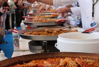 Lo primero que me llamó la atención fue ver tanta paella alineada listas para cocinar. Me daban ganas de ponerme el delantal y a hacer la Fideuà, pero el concurso es sólo para profesionales. Hoy me toca mirar y degustar, que también está bien.