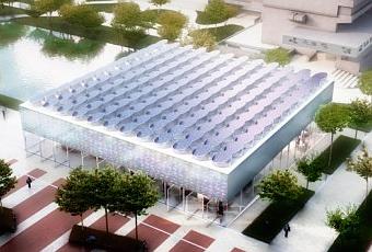 Usando la luz y energía solar como punto de partida, el pabellón es una estructura transparente con un fachada totalmente vidriada. La cubierta, con un sistema integrado de paneles solares inteligentes, permite que la luz natural se filtre e ilumine el interior. Una cuidadosa consideración respecto dela orientación y ubicación de los accesos lumínicos del techo, aseguran que tanto la luz directa como el sobrecalientamiento no ocurran. Otras aplicaciones sustentables dentro del pabellón incluyen una bomba de calor Geotermal, un núcleo de concreto térmicamente activo, y el uso mínimo de materiales.