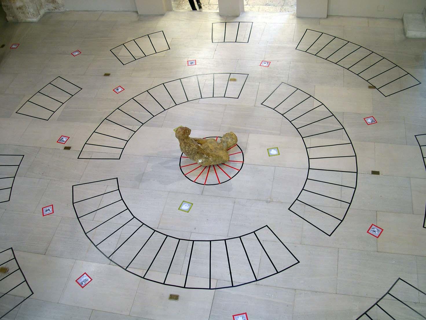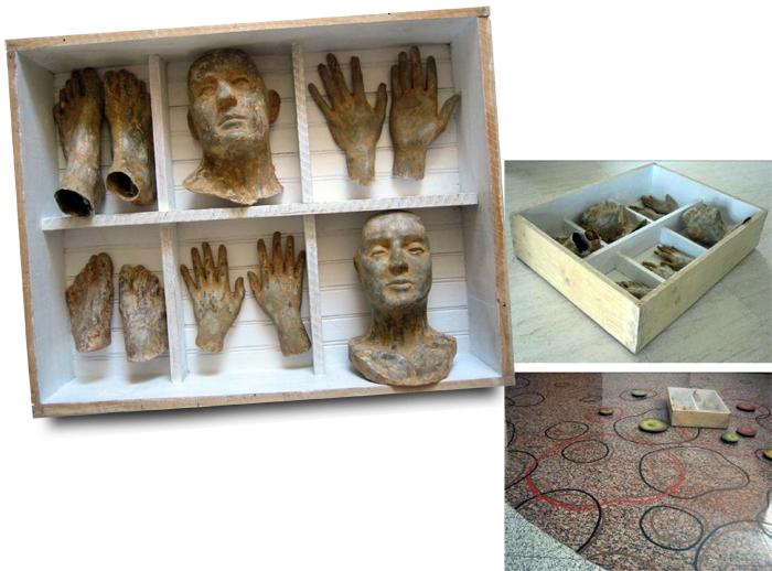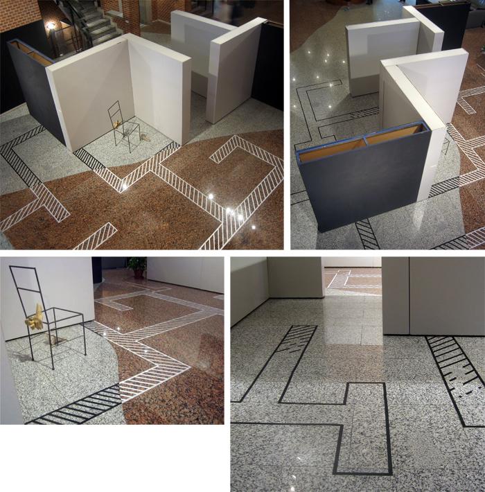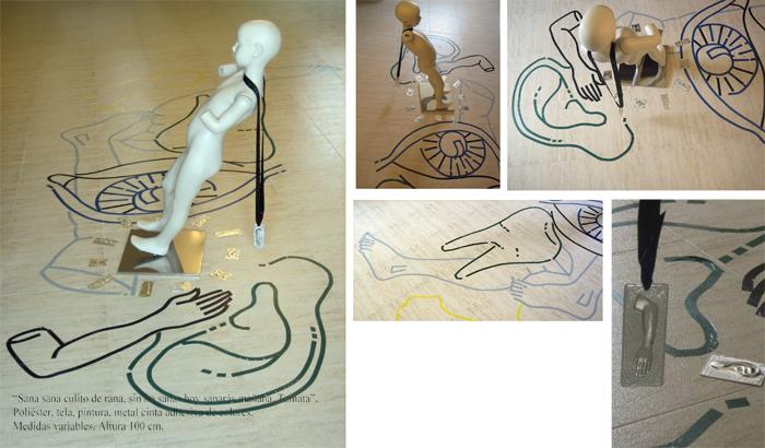 Poliéster, madera, cinta adhesiva, dibujos a plumilla. 90 x 98 x 55 cm.