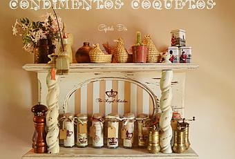 Los especieros son frascos de vidrio decorados con papel vinilizado (preparado para facilitar su limpieza) que repite el diseño de corona. Todos llevan etiqueta de madera para anotar el contenido, y tapa sombrerito de arpillera.
