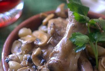 Piernas y paletillas de un conejo de granja;150gr. de cebollitas francesas (las mías congeladas de La Sirena);150gr. de champiñones;1 diente de ajo picado;1/2 vaso de vino blanco;2 cucharadas de aceite de oliva;1 vaso de agua;perejil (limpio y picado);1 cucharada de tomate concentrado;sal y pimienta en granoPreparación:1. Lavamos y secamos las piernas y paletillas de conejo y las marcamos en la cacerola con el aceite. Reservamos.2. Limpiamos los champiñones y los cortamos en láminas. Los rehogamos junto con las cebollitas y dejamos pochar unos cinco minutos3. Agregamos el conejo reservado y damos unas vueltas.4. Rociamos el conejo con el vino y esperamos a que se evapore.5. Agregamos el tomate concentrado, previamente desleído con el agua y proseguimos la cocción del conejo unos 30-45 minutos, dando la vuelta al conejo de vez en cuando.6. Rectificamos la sal y la pimienta y servimos el conejo.