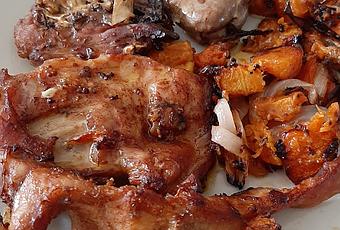 Lavar y pelar la calabaza y la cebolla, trocear en gajos pequeños. Si preferís los trozos más grandes, tendríais que hacerlas previamente durante unos 10 minutos. Para que se ablanden y luego queden en su punto tras el horneado.