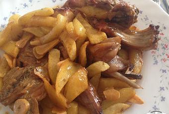Mientras se va haciendo el conejo, preparamos una fuente de patatas fritas, ese será su acompañamiento. Una vez fritas, agregar las patatas en la cazuela junto con el conejo y cocinar unos minutos sin que se rompa las patatas.