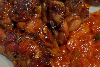 Colocar los trozos de conejo y la fritada. Salsear con el jugo que ha soltado el conejo y servir.