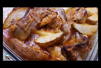 2.- En una fuente de horno el conejo macerado, le añadimos las papas cortadas y las mezclamos bien con el mojo rojo. Precalentamos horno a 180º cocinamos la carne con las papas 40 minutos en el horno. Le damos la vuelta a los 20 minutos para que se cocine bien por todos los lados. Lo retiramos del horno y lo servimos caliente.