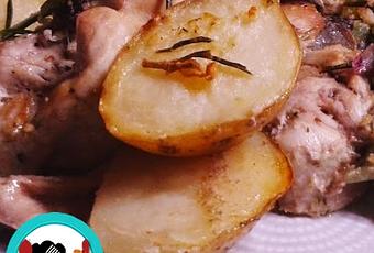 4.- Precalentamos el horno a 180ºC. Horneamos durante 35 o 40 minutos, vamos recogiendo el jugo de la fuente y regando el conejo cada 10 minutos. Servimos el conejo con las patatas y los champiñones y un vaso de vino tinto.