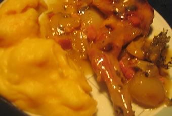 INGREDIENTES (para 2): 1/2 conejo troceado, 1 cebolla grandota y unas cuantas chalotas, 3 dientes de ajo, 75 gr. de bacón y 75 de jamón serrano (ambos en tacos o tiras), 1 lata de champiñones grande, 1 cucharada de harina o maicena, zumo de medio limón, 1 cucharada de margarina, 2 vasos grandes de cava, sal, laurel, tomillo y ajo en polvo.