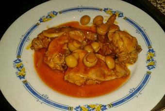 Ingredientes:- 1 conejo.- 1 pimiento verde.- 1 cebolla pequeña.- 1 bote de champiñones.- 1 bote de tomate frito casero.- Medio vaso de vino blanco.- Aceite de oliva virgen extra.- Un chorro de coñac.- 2 dientes de ajo.- Sal y pimienta.