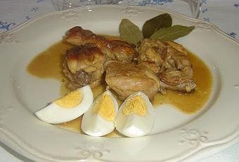 Un conejo1/2 vaso de aceiteuna cebolla200 gr de jamón en daditosun ramo hecho de perejil, laurel y romero2 cucharadas de harinaun vaso de vino blanco4 dientes de ajo10 almendras2 clavos3 yemas de huevounas hebras de azafránun huevo duro para adornarsal y pimienta