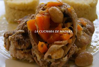 En un plato, colocamos un aro y ponemos dentro el cuscús apretando con una cuchara, haremos dos aros y en lado colocamos unos trozos de conejo con zanahora, ajos y almendras