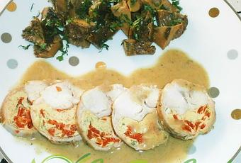 Poner una sartén al fuego con un poco de aceite de oliva y sellar el rollo por todos lados. Sacar a una cazuela.