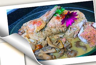 Doramos las chalotas en aceite del conejo con 250g de setas variadas.Poner la mitad en la cocotera, colocar el conejo y cubrir con guarnición.Regar con un vaso de vino blanco seco, 2 de caldo y dos cucharadas de brandy, tapar y cocinar a fuego lentos 1 hora y media.