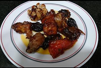 Esta es una receta que siempre hemos elaborado en casa, tanto mi yaya como mi madre pero con pollo rustido a la catalana. Pero como a mi marido no le va demasiado el pollo pero yo lo elaborado con conejo.INGREDIENTES:1 conejo cortado a cuartos2 tomates2 cebollas5 ajos sin pelar1 cabeza de ajos entera1 puñadito de prunas (ciruelas pasas sin hueso)1 hoja laurel1 ramita de canela2 vasos de jerez secoSal y pimientaELABORACIÓN:En una cazuela de barro añadiremos aceite de oliva, no escatimaremos, sofreír a fuego medio el conejo.Cuando esté dorado añadir la cebolla cortada, los dientes de ajo sin pelar la cabeza de ajosel laurel y la ramita de canela.Sal a vuestro gusto. Sofreír a fuego medio. Cuando la cebolla esté cocida añadir las uvas pasas, los tomates partidos por la mitad las ciruelas y los piñones, dar unas vueltas y añadiremos el jerez seco. Dejaremos cocer todo junto a fuego lento durante unos 15 minutos.