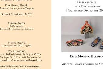 Este sábado 4 de Noviembre, y a las 12 de la mañana, presentaré en el Museo Provincial de Segovia la Pieza Desconocida de los meses de noviembre y diciembre del 2017: un trío de complementos femeninos formado por una montera, un cinto y unos zapatos de Turégano. Son muchos los detalles por desgranar, y por ello voy a sumar a la presentación una conferencia posterior.