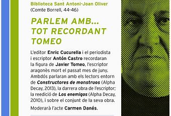 Hoy lunes 27 de enero a las 19.00 hs en la Biblioteca de Sant Antoni-Joan Oliver (C/ Comte Borrel, 44-46, Barcelona) tendrá lugar una conferencia sobre el escritor Javier Tomeo,en la que participarán el editor de Alpha Decay, Enric Cucurella, y el escritor y periodista Antón Castro, moderados por Carmen Danés.