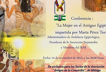 Marta Pérez, administradora de Andalucía Egiptológica y presidenta de la Asociación de Mujeres Najmarabic, de Málaga, ha impartido hoy su conferencia sobre "La mujer en el Antiguo Egipto" en la Asociación "Amigos de la Concordia" de Málaga, con aforo completo y entusiasmo por parte del público.
