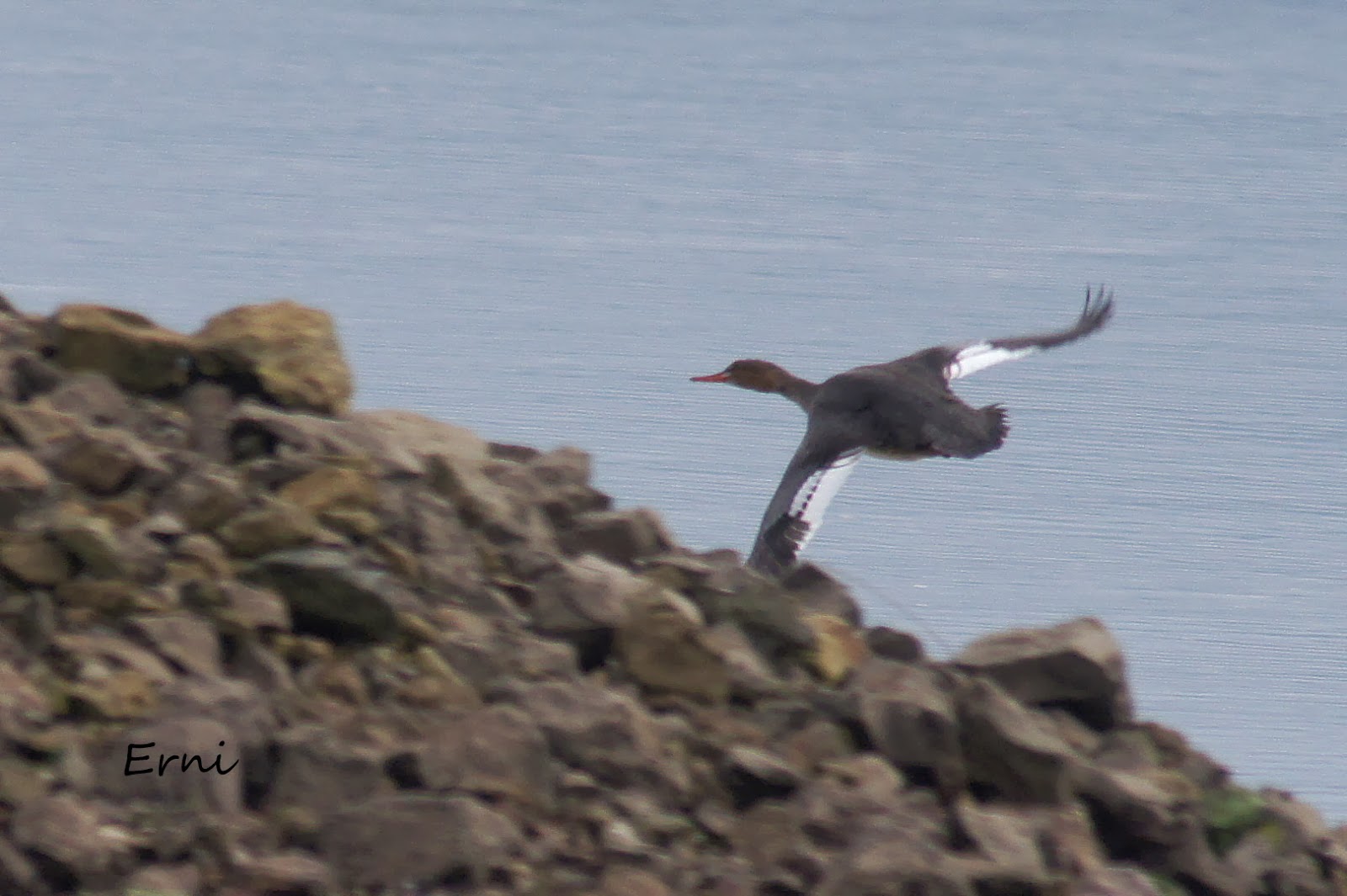 Una serreta mediana, mucho más tímida, huyó volando cuando la sorprendí en una pequeña charca.