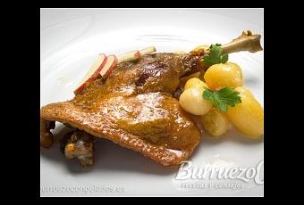 Disponer los muslos de pato en una bandeja resistente al calor y hornear a 170ºC, con gratinador, durante 35 minutos, girándolos un par de veces para conseguir un tostado homogéneo.