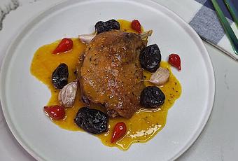 En casa no lo había cocinado antes por el trabajo que tiene, bueno más que trabajo es tiempo y no es facil tenerlo, con esta vida ajetreada que llevamos.Os voy a explicar un poco en que consiste el confit de pato, en francés se diría confit de canard, es un plato francés muy conocido, que se escalfa en su propia grasa.Para preparar un confit, la carne se frota con sal y ajo, se cubre y se enfría por 36 horas aproximadamente.El salado funciona como conservante.Antes de cocer la carne, se limpia la sal y se seca, después se pone en un recipiente lo suficiente hondo para poner la carne y la grasa derretida y se mete al horno a unos 135º.La carne se escalfa desde 90 minutos hasta 10 horas hasta que la carne este tierna.Yo ese paso me lo he saltado y me he ido a lo rápido he comprado una lata ya con los muslos confitados, me quito la faena gorda y disfruto de ellos igualmente.Los he terminado de hacer en el horno y le he hecho una salsa de naranja.A ti, te gusta el confit de pato?Lo has comido alguna vez?Seguro que te interesa la receta, verdad?Pues vamos a ella, que te la explico!!Y ya con esta receta, me despido del blog hasta el año que viene.Os deseo unas felices fiestas y un próspero año nuevo 2025.Os deseo lo mejor, nos vemos a la vuelta, ser felices!!Ingredientes:4 muslos de patoEl zumo de tres naranjasRalladura de la piel de las naranjasUna cucharada de azúcar morenoUna rama de canelaSal y pimienta20 ciruelas con huesoUna cabeza de ajosUna cucharada de mediana de maicena.Un bote de pimientos lagrimaPreparación:Precalentamos el horno a 200º Metemos los muslos en la bandeja del horno y ponemos los dientes de ajo.