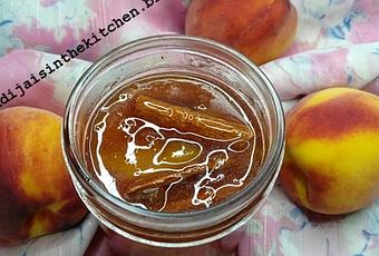 3- في طنجرة ، يوضع الخوخ والقرفة المطحونة والسكر وعصير الليمون. يترك الخليط جانباً حتى يذوب السكر قليلاً، حوالي 15-20 دقيقة، ثم يطهى على نار متوسطة.