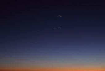 Los colores del atardecer siempre me han parecido mágicos. Captar los últimos instantes donde los rayos de Sol iluminan las capas de nuestra atmósfera, creando esos colores rojizos y únicos me impresiona siempre de manera especial. Bajo la Luna creciente las estelas de los aviones rompen el azul del cielo.