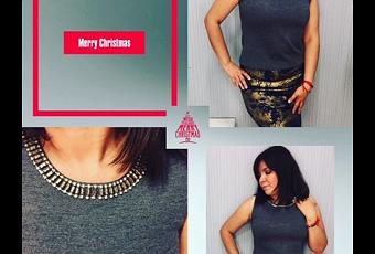 Blusa en color gris sin mangas tiene en el cuello cristales ese detalle nos ayuda a ya no usar un collar, la falda es del estilo lápiz en color azul con dorado aunque al principio tenia dudas de las texturas y colores el resultado me gusto.