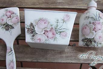 Con estos tres elementos que ves en la foto de abajo, he creado un bonito conjunto para el baño. También puedes hacerlo con vasos, pequeñas bandejas y cajitas. De la forma que te voy a enseñar, podrás mojarlo sin ningún problema. Cualquier superficie, metálica o plástica.