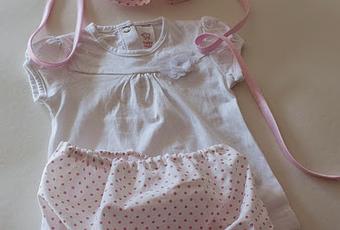 La tela es una algodón finísimo, muy suave y fresquito. Y como único adorno un biés de raso en rosa, a juego con los toditos de la tela.