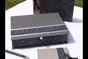 Que os parece este conjunto para regalar en una boda?Dicen que el color gris es triste, pero a mi me parece de lo más elegante, y a vosotr@s ? Esta compuesto por un libro firmas,( se puede utilizar como álbum de fotos también ) con su bolígrafo a juego, un porta CD. para guardar momentos inolvidables y la caja a conjunto para guardarlo todo. Totalmente personalizable . ..........