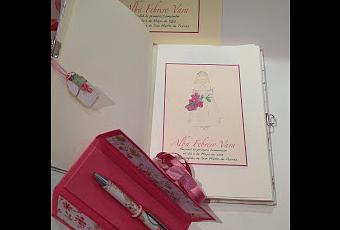Dos conjuntos de diario y funda para bolígrafos para dos hermanas que hacen la comunión este año. A Iría le apasionan los osos de peluche y a su hermana Alba las hadas