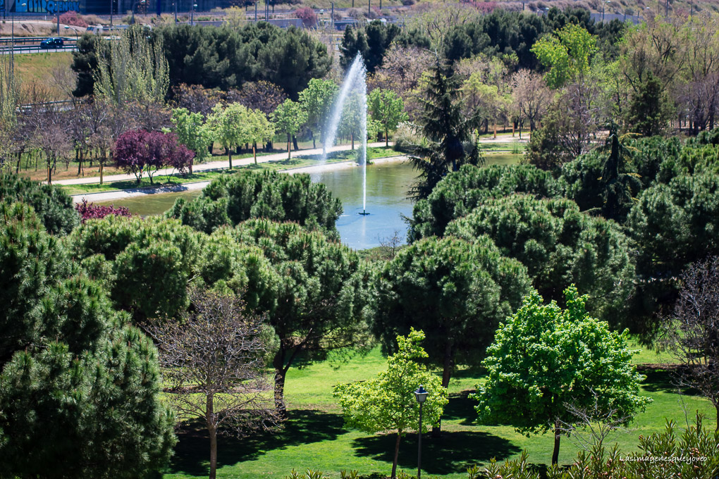 Cuando vas con el coche por la M30 de Madrid, a la altura de Legazpi, bordeas este extenso parque urbano de 40 hectáreas lleno de estanques con chorros verticales de agua, praderas de césped y una colina desde la que lo puedes divisar desde las alturas.