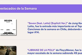 - “Seven (feat. Latto) (Explicit Ver.)” de Jung Kook y Latto, fue la entrada más importante en el Top Canciones de la semana en Chile, debutando en el lugar #14.