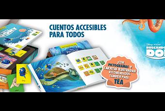 Por un lado formato maletín que incluye, además del cuento, tarjetas ilustradas y Pictogramas. Muy recomendados para niños con TEA o alteraciones de la comunicación, y por otro, cuentos adaptados para baja visión.