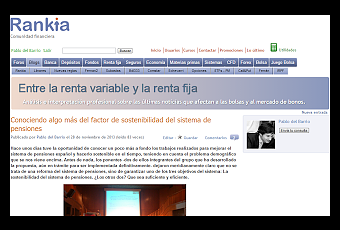Analizo en exclusiva para la comunidad financieraRankia las modificaciones realizadas por la comisión de expertos en materia del factor de sostenibilidad del sistema de pensiones de España. En el artículo se repasan todos los supuestos posibles planteados en el acto organizado por Inversión y Finanzas.com, incluso el más extremo de todos (hipotética pérdida de un 30% del poder adquisitivo), así como la fase en la que nos encontramos y fechas de implementación de la que hasta hoy es una propuesta para que las pensiones suban en torno a la inflación y según las condiciones estructurales económicas del país. Dos de los ponentes pertenecen a la comisión de expertos, por lo que no puede ser información más veraz y actual. Además de debatir en la mesa redonda dicha propuesta y su elaboración, se trataron otros aspectos económicos de calado que la rodean y que irremediablemente surgieron durante la confección de la misma, en un trabajo que duró mes y medio. Para finalizar, Ángel Expósito entrevistó a Luis Garicano, profesor de la London School of Economics, quien nos dibujó el panorama económico de España con cierto optimismo, pero de forma muy moderada y con muchas dificultades y retos por delante (Leer artículo completo)