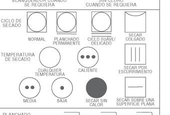 El secado puede ser a mano o a máquina, la intención es eliminar el exceso de agua de la prenda. Su símbolo se representa con un círculo envuelto en un cuadrado para el secado en secadora.