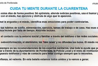 El Ayuntamiento de Ponferrada acaba de enviar una imagen con el fin de que los ciudadanos la puedan compartir en Redes Sociales y por mensajería con consejos de psicólogos para tener una salud mental correcta. Medidas que van desde normalizar los horarios, hasta evitar la sobreinformación de noticias falsas.