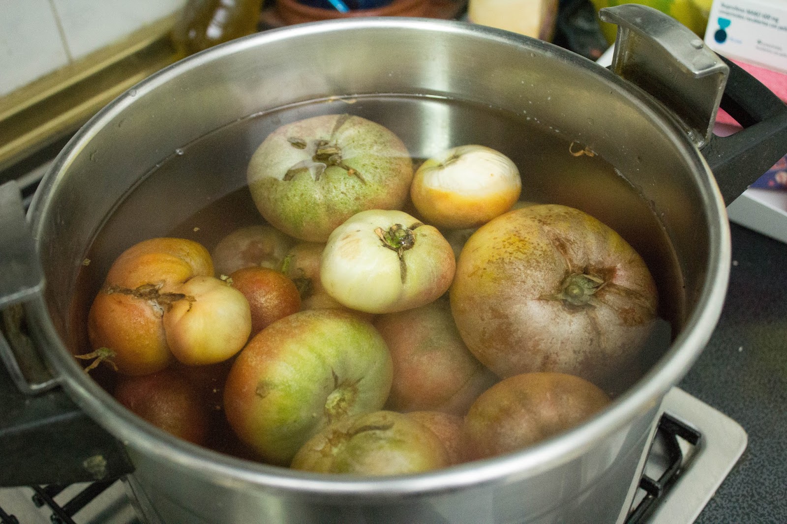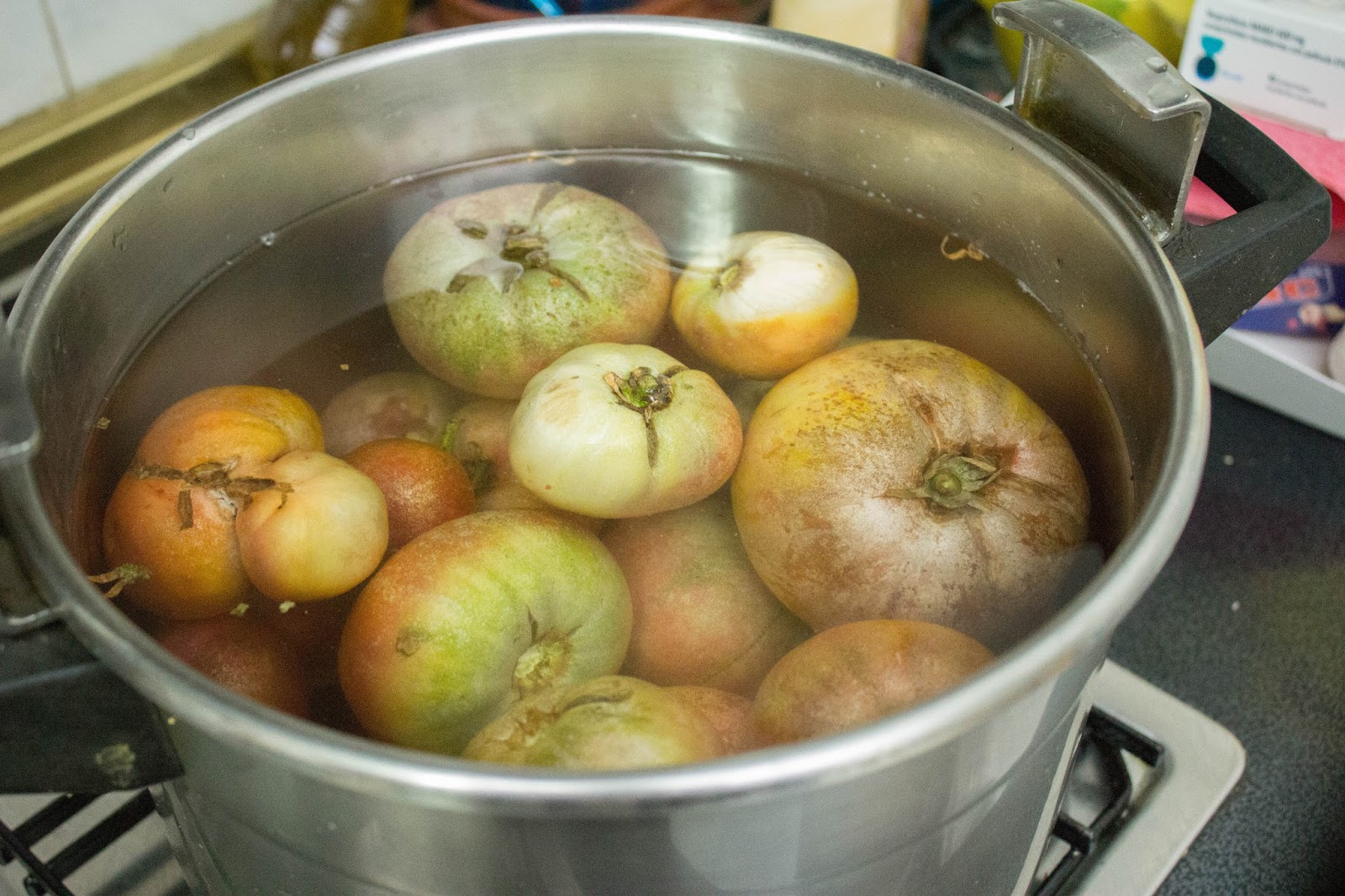 Lavar bien los tomates, poner los tomates en una cazuela y cubrirlos de agua.