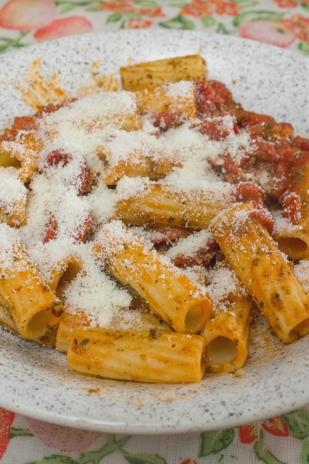 Servir la salsa por encima de la pasta o en el plato que quiera. Luego añadir queso en polvo o lo que más te guste en la pasta.