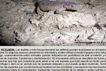 Los reptiles y más frecuentemente los anfibios pueden localizarse en el interior de las cavidades. En algunos casos su presencia es voluntaria y suelen utilizar el medio hipogeo como refugio. Sin embargo, ocasionalmente estos animales quedan atrapados sin posibilidad de salir al exterior y acaban muriendo de inanición, hipotermia o deshidratación. En el presente artículo se describen de forma general los aspectos que hay que considerar para saber si es una especie que está usando el medio cavernícola como refugio o bien es un animal que ha quedado atrapado y que puede acabar muriendo. También se muestran las especies que comúnmente se localizan en las cavidades y se exponen las recomendaciones más generales sobre su manipulación, transporte, reconocimiento de su estado y sobre cuándo y dónde liberarlos si procediera.