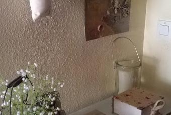 Y esta mañana tocaba pintura. Así ha quedado la consola que "recogí" el otro día: Pintada en chalk paint verde agua, desgastado en blanco, con ligeros toques en marrón chocolate y découpage (alguna flor tenía que aparecer por aquï).