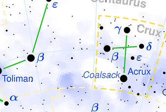 Alfa Crucis (Acrux): En realidad esta estrella es un sistema múltiple. Las dos estrellas principales (ambas de clase espectral B) tienen un brillo 25 000 y 18 000 veces superior al del Sol, respectivamente. Se orbitan mutuamente en un periodo de al menos 1500 años, a una distancia mínima de 430 UA. Se encuentra a unos 320 años-luz de distancia de nosotros. Es la estrella de primera magnitud más meridional del cielo.