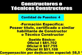 Requisitos Excluyentes- Ser ciudadano/a natural o legal.Deberán estar inscritos en el Registro Cívico Nacional. Los ciudadanos legales no podrán ser llamados a empleos públicos sino tres años después de habérseles otorgado la carta de ciudadanía.- Tener 18 años o más de edad cumplidos al día anterior al inicio de las inscripciones.- No ser funcionario público al momento de la designación del cargo a excepción de la docencia- Haber cursado y aprobado los tres años de Educación Media Básica (Ciclo Básico) UTU o equivalente.- Acreditar experiencia mínima de tres años en actividad afines a las descritas, mediante comprobante del Sistema Nacional de Seguridad Social u organismos extranjeros equivalente, con experiencia en trabajos sanitarios.- Formación Específica: Haber cursado y aprobado alguna de las siguientes formaciones, equivalentes o superiores:- Poseer título, certificado o similar habilitante de Constructor o Técnico Constructor expedido por el Concejo de Educación Técnico Profesional (ex UTU).