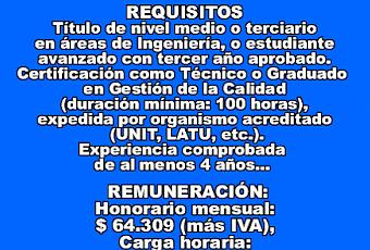 Requisitos Excluyentes:Título de nivel medio o terciario en áreas de Ingeniería, o estudiante avanzado con tercer año aprobado.Certificación como Técnico o Graduado en Gestión de la Calidad (duración mínima: 100 horas), expedida por organismo acreditado (UNIT, LATU, etc.).Experiencia comprobada de al menos 4 años en producción de estadísticas o implantación de Sistemas de Gestión de la Calidad.